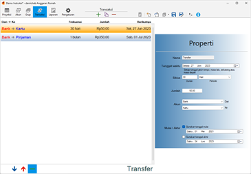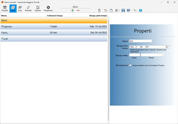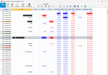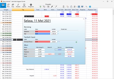 Transaksi Berulang (tagihan, pengeluaran) diberi jumlah rata-rata yang mendekati apa yang Anda harapkan. Semua hasilnya ditampilkan di halaman Proyeksi yang kuat. Halaman ini menunjukkan setiap kejadian Transaksi berulang pada hari yang ditentukan. Contoh transaksi berulang hampir tidak pernah merupakan jumlah rata-rata yang dimasukkan dan sebagai kompensasi, setiap entri individual pada halaman Proyeksi dapat diperbarui ketika jumlah sebenarnya diketahui. Transaksi individual ini juga dapat dipindahkan ke akun lain jika perlu, misalnya saat membayar dengan kartu kredit pada minggu-minggu saat Anda kekurangan uang. Pada halaman proyeksi Anda juga dapat menambahkan transaksi satu kali sebanyak yang Anda suka. Semua jumlah yang diperbarui disorot untuk referensi mudah. Antarmuka yang sederhana memungkiri kompleksitas tersembunyi dari kode yang mendasarinya.