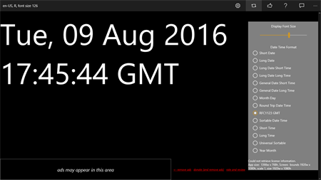 This application displays the date and time in small, medium, large, and HUGE characters for easy viewing. The application displays: