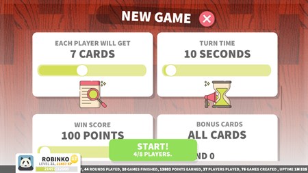 The online card match can be fully customizable. In your own lobby, you decide how many points players need to win, how many cards you get at the start, what special uno cards will be available in card pile, etc. Customize how many cards of each type are in the card pile! Set more Wild cards, or more skips, it’s up to you! Tune your card pile and make the match fun!