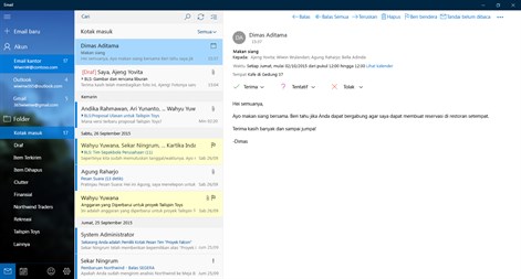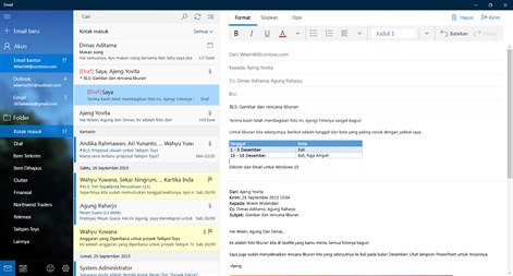 Aplikasi Email dan Kalender membantu Anda tetap up-to-date dengan email Anda, mengelola jadwal, dan tetap berhubungan dengan orang-orang yang paling Anda pedulikan. Didesain untuk di kantor dan di rumah, aplikasi ini membantu Anda berkomunikasi dengan cepat dan fokus pada hal penting di semua akun Anda. Mendukung Office 365, Exchange, Outlook.com, Gmail, Yahoo! dan akun populer lainnya.