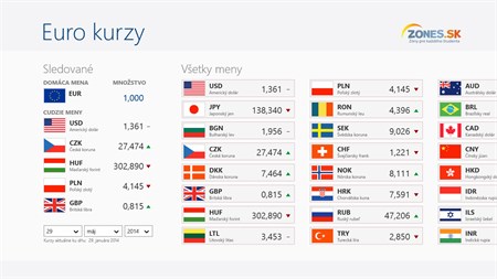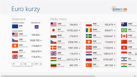 Informácie o aktuálnom kurze Eura v jednoduchej prehľadnej podobe a prevod do iných mien, to je aplikácie Euro kurzy. Aplikácia umožňuje prevod medzi menami podľa aktuálneho kurzu Európskej centrálnej banky. Môžete si zvoliť prevádzanú sumu, Vaše obľúbené meny, príp. aj nastaviť inú domácu menu ako Euro.