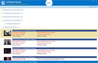Exif Batch Checker is the #1 application for checking your photo/video collections and archives for missing Metadata (Exif data), making those precious photos easier to find and organize.