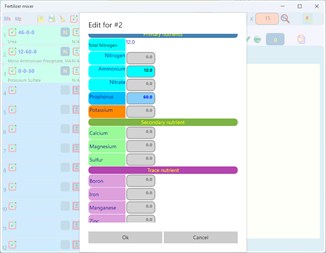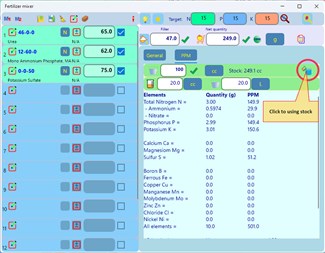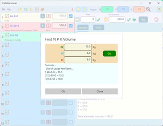 This application use for calculating mixing some different fertilizer rating to desired rating, maximum 15 fertilizer rates -User can manually adjust each fertilizer rate's quantity until get desired rate -Or use automatic find mixing proportion of each fertilizer rate if it possible to give desire rate -User can test filler to find another fertilizer rating -User can define net total quantity of mixed fertilizer, so user will know how much of each fertilizer rate's quantity to be used -There are 2 default set of key fertilizers to be use or user can key in another available fertilizer to be mixed such as 21-21-21 + 15-0-0 + 0-0-50 for example. -Estimating of fertilizer concentration in PPM (Part per Million) unit