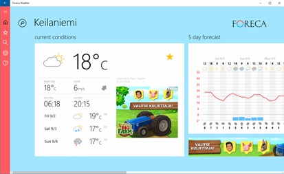 ForecaWeather provides current conditions, 10 day weather forecasts and weather animations for any location world-wide. You can choose from over 140.000 locations.