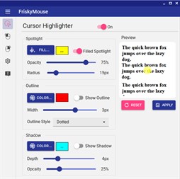 With FriskyMouse, you can add a highlighter around your mouse cursor and visually indicate the location of your mouse left or right clicks using a set of different ripple effects, enabling your audience to follow your mouse movements with ease.