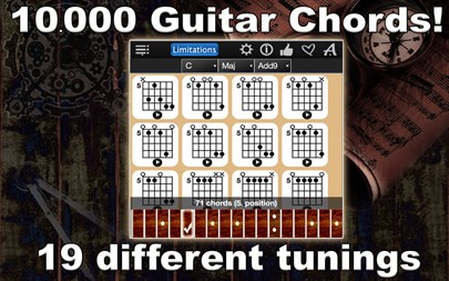App features: - Number of the chords: 10,000, - Possibility to listen to each displayed chord, - Drag&Drop selected chord diagrams into editors (for your own songbook creations), - Supported 56 chord types: Maj, Maj 6, Maj 7, Maj 9, Maj 11, Maj 13, Maj Maj7, Maj Add9, Min, Min 6, Min 7, Min 9, Min 11, Min 13, Min Maj7, Min Add9, Dim, Dim 6, Dim 7, Dim 9, Dim 11, Dim 13, Dim Maj7, Dim Add9, Aug, Aug 6, Aug 7, Aug 9, Aug 11, Aug 13, Aug Maj7, Aug Add9, Sus2, Sus2 6, Sus2 7, Sus2 9, Sus2 11, Sus2 13, Sus2 Maj7, Sus2 Add9, Sus4, Sus4 6, Sus4 7, Sus4 9, Sus4 11, Sus4 13, Sus4 Maj7, Sus4 Add9, 5, 5 6, 5 7, 5 9, 5 11, 5 13, 5 Maj7, 5 Add9, - Authentic guitar chord sound, - All common guitar tunings are available: 1. Standard, 2. New standard, 3. Lute, 4. Half tone flat, 5. Whole tone flat, 6. Half tone sharp, 7. Whole tone sharp, 8. Drop B, 9. Drop C, 10. Drop D, 11. Double dropped D, 12. Celtic, DADGAD 13. DADADD, 14. Open A, 15. Open C, 16. Open D, 17. Open E, 18. Open G, 19. Slide open A, 20. Standard C, 21. Esus, 22. Drop C#, 23. Low C, 24. All Fourth, - Left-Handed player's support, - Volume control.