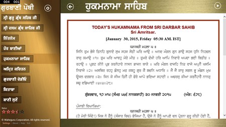 V 1.1.0 1. Sri Guru Granth Sahib Ji 2. Sri Dasm Granth Sahib Ji 3. 35 Bani (Nitnem, Sukhmani Sahib, etc) 4. AMRIT KIRTAN 5. 9 Radio Channels including HARIMANDIR SAHIB 6. Listen & Download Banis 7. Share Gurbani on FB, WhatsApp, Email, MMS, etc 8. Gurbani Books/ Janam Sakhis/ Steek etc.