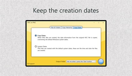 Your conversion, your way. • Create PNG files in a new folder, optionally preserving the original HEIC folder hierarchy. • Create PNG files side-by-side with the original HEIC files, with the same filename. • Copy the creation and modification dates, or use the system dates. • Runs locally, no internet required
