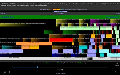 From Big Bang to today: zoom and scroll through world history. One or two out of 14 timelines can be displayed "to scale". Your Screen is the scaling reference for time. Each history event has a link into Wikipedia.
