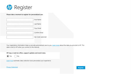 Register with HP enables you to register your device with HP for personalized care. At HP, we are dedicated to delivering the best customer experience to you. If you happen to need support, the registration information we have about you and this computer will allow our support team to help you quickly. Also, if you agree to let us contact you, we will send you product and service offers, support updates, market research opportunities, or other event news. Each promotional email you receive allows you to unsubscribe from future promotional emails.