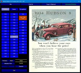 Hudson Motor Car Company Ads 1910 - 1957 is a nostalgic tour through the style and hype of the automobile advertising industry from the classic days of cars. Includes nearly 300 magazine ads as they appeared during the period from one of the last of the independent car makers in the US. Represented are Hudson, Essex and Terraplane.