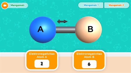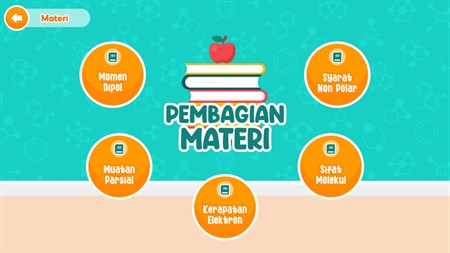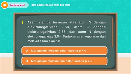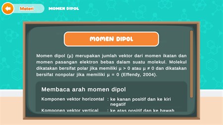 Aplikasi Ikatan Kovalen Polar Non Polar adalah aplikasi yang berisi materi kimia yang membahas tentang ikatan kovalen polar dan ikatan kovalen non polar. Dalam aplikasi terdapat 3 menu utama yaitu: materi, pengamatan, dan kuis. Pada menu materi terdapat 5 materi disajikan dengan slide. Untuk menu pengamatan disajikan dengan menampilkan model 3D. Dan untuk kuis disajikan soal pilihan ganda.