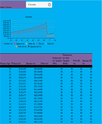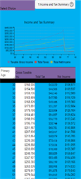 The Income and Tax Planner application is a sophisticated calculator that takes into account your income, retirement income, and the tax code to project your year to year income and taxes. Taxes take into account taxable income, taxable social security income, investment income and child tax credits calculating your federal tax, state tax, and social security/medicare tax. The tool has a nice graphical output and tables to show details on income and tax summary, taxes, effective tax rates (state and federal), income, filing status, deductions and exemptions and tax credits. The tool gives you the ability to modify your plan, year by year, as needed to custom a plan specific for your life situation. A very nice, handy, income and tax calculator.