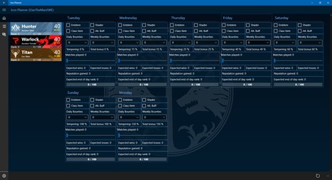 Iron Planner is an unofficial companion app for the Iron Banner event in Bungie's Destiny. Use it to plan how many matches / bounties you have to complete in order to reach your wanted rank.