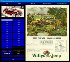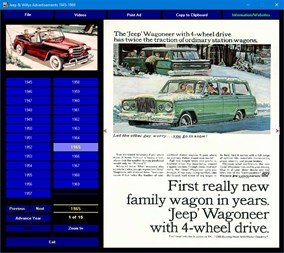 Jeep & Willys Advertisements 1945-1969. Take a nostalgic tour through history. Experience the style and hype of the automobile advertising industry from the glory days of cars. This DVD-ROM includes over 200 Jeep magazine ads as they appeared during the period. They're all here: the classic WWII type Jeep, the Jeepsters, the Jeep Wagons, the Willys autos and more. This collection of magazine ads starts in 1945 and proceeds through 1969. Also included are 2 videos chronicling the history of the famous Jeep.