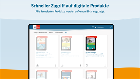 • einfache Anmeldung in der App mit den Klett-Zugangsdaten für Schüler:innen und Lehrer:innen • alle lizensierten, digitalen Produkte werden auf einen Blick angezeigt • nach dem Download in die App sind die Produkte auch offline aufrufbar • Aktivierung neuer Produkte durch Eintippen des Nutzer-Schlüssels • Zugriff auf über 2.500 digitale Titel