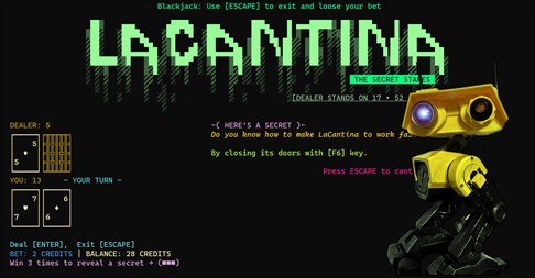 LaCantina is distributed in 5 different floors: * The Basement Chamber where you can win credits answering trivia questions. * The Secret Stakes room where you can play Blackjack with your Units. They will be making jokes and eventually revealing secrets about the game and features. * The Lobby distributed as following: - A reception area divided in two places (Talking Area & Processing Area). - Two celebration holiday rooms (Christmas & Halloween). - Two different stores where you can acquire memberships to specific rooms. - A bartender saloon where you can order drinks for your Units. * The Art Gallery where you can enjoy ancient art made with ascii characters. * The Starlight Theater where you can enjoy a movie with the company of your units.