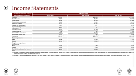 Last 10K displays an in-depth catalog for every part of a company's financial statement from earnings and revenue to cash flow trends, debt load and more. Behind each of these are detailed tables presenting raw financial values that have been optimized for Windows tablets for easy reading and sharing. Use this data to form an unbiased stock analysis and fully assess the financial health of a company.