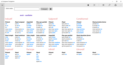 Le Conjugueur permet de conjuguer tous les verbes français de manière autonome sans connexion Internet. En plus de la seule conjugaison, il contient une liste de tous les verbes ce qui permet de retrouver l'orthographe exacte d'un verbe.