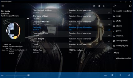 Features: - full playlist control (remove track, change track order, sort, shuffle) - two main views: - playlist view - now playing view with gesture support - add tracks from specific folder (including subfolders) - search for tracks - browse tracks by title, artist, album and genre - add tracks from SD card - download and play music from OneDrive - display album art - display lyrics from mp3 tag - in app volume control - auto saving playlists - multiple themes support - save unlimited playlists - it remembers last playback position - share single song from playlist - share multiple songs from library browser - FLAC support