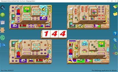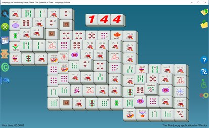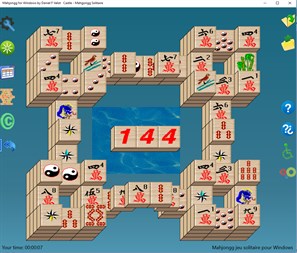 Mahjong solitaire is a solitaire matching game that uses a set of mahjong tiles rather than cards. The 144 tiles are arranged in a special four-layer pattern with their faces upwards. A tile is said to be open or exposed if it can be moved either left or right without disturbing other tiles. The goal is to match open pairs of identical tiles and remove them from the board, exposing the tiles under them for play. The game is finished when all pairs of tiles have been removed from the board or when there are no exposed pairs remaining. Tiles that are below other tiles cannot be seen. But by repeated undos and/or restarts which some programs offer, one gradually gets more and more information. Sometimes, tiles are only partially covered by other tiles, and the extent to which such tiles can be distinguished depends on the actual tile set. This version of Mah jongg solitaire provides 13 missions and seventeen languages support.It is able to build solvable games by reverse playing. You can also build random games. Undo and redo feature can be very valuable when you find yourself trapped. The desktop version includes mouse emulation for disabled peoples and keyboard shortcuts to play faster.