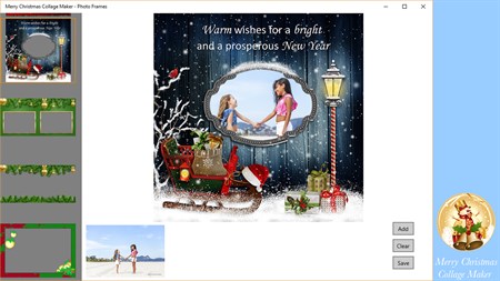 1. Select the frame you want on the left side of the app. 2. The image preview of the frame you chose will appear on the screen. 3. Click [ Add ] to add the photo you want on the frame. 4. Your photo will appear on the frame. You can add more photos if the frame allows. 5. Click [ Clear ] if you want to delete any photo you've added. 6. Click [ Save ] and select the folder you want to save your card.