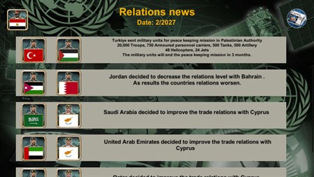 Become the Supreme Commander of the Middle East in this immersive strategy war game. Select your nation (Egypt, Palestinian Authority, Iran, Lebanon, Syria, Turkey, Jordan, Iraq, Kuwait, Saudi Arabia, United Arab Emirates, Yemen, Oman, Qatar, Bahrain, Cyprus, or Israel) and battle against intelligent AI enemies.