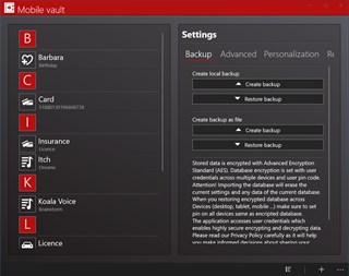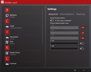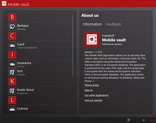 With Mobile vault, you can safely store any data that you like, such as reminders, memories, text, numbers, etc. Mobile vault is protected with the user's PIN code and stored data is encrypted with the Advanced Encryption Standard (AES) in the encrypted database. This Application run on all devices that run Windows 10 (Desktop, tablet, mobile ) We would appreciate it if you sent feedback and if you report an error to our email address, please provide the date of the error or incorrect translation based on the device type, operating system and application version number.
