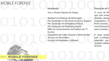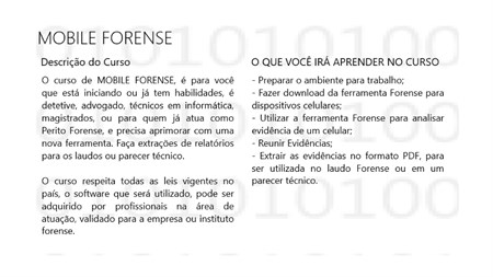 O curso de MOBILE FORENSE, é para você que está iniciando ou já tem habilidades, detetive, advogados, técnicos em informática, magistrados, ou quem já atua como Perito Forense, e precisa aprimorar com novas ferramentas e para as pessoas que tem curiosidade em entender como é realizado uma perícia em um celular. Faça extrações de relatórios para os laudos ou parecer técnico. O curso está no idioma em português, para facilitar a compreensão. Tem uma grande parte teórica seguida por slides e a parte prática, demostrada por vídeo. Para os profissionais de celulares que tem um estabelecimento comercial, será de grande auxílio nas tratativas profissionais. Estou seguindo e respeitando todas as leis vigentes no país, como a LGPD, lei de nº 13.709 e a lei de nº 12.737 que orienta e mostra todos os termos éticos para estudo e treinamento do profissional, para capacitá-lo de forma correta e consciente.