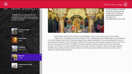 Monuments & Places-INDIA is a great app which gives lot's of information about different cultural places and monuments of India. It guides the user about the history and location of chosen place of ancient as well as new places which are worth visiting in INDIA via Bing maps .