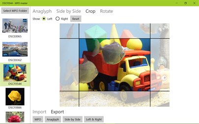 With MPO master you can: - browse MPO files as red/cyan anaglyphs and side-by-side stereo images - adjust stereoscopic parallax of stereo image - create stereo images from left and right views - extract left and right views from stereo images - import stereo images as MPO and side-by-side stereo images - export stereo images as MPO, red/cyan anaglyphs and side-by-side stereo images - correct rotation and crop of stereo image When registering on Support Forum anti-spambot password is "win10".