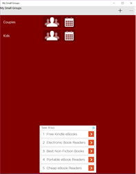 This application allows users to keep track of who is in each of their church's small groups. It also helps the user track the attendance for their small group meetings so that they can report the attendance back to their church. It has the following features: - An unlimited number of small groups can be entered - Each group can have an unlimited number of regular members - Each group can also have an unlimited number of meeting dates - The ability to add occasional members to an individual meeting so that they can be added to the attendance list is also included - An email can be sent for each meeting to a central contact to report small group attendance. The user can also use this email to provide any appropriate notes on content or prayer requests that might come up during that week's meeting.