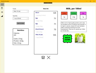 With Nutrition Calculator, you can calculate the nutritional information for any meal. There are over 200 foods to choose from, each with their own quantities. Save all your meals for the day to keep track of how many calories you are consuming daily. Set yourself a target weight, and use Nutrition Calculator to help you keep track of your stats.
