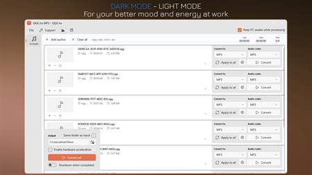 • Enable hardware acceleration to save time. • Auto shutdown when completed. • Save time with multiple files processed at once or focusing on a single audio.