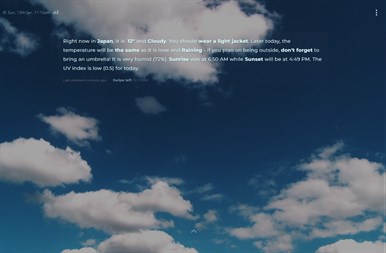 + Accurate, comprehensive weather forecast + Multiple themes to choose from (requires PRO account) + Settings syncing across multiple devices (requires PRO account) + Human-word weather summaries + Personalized weather advice + A.I. suggested activities for every weather type + Safety tips for severe weather + Push notifications for severe weather coming soon + Available on both phone and desktop + Soothing background music (requires PRO account) + Ambient sound effects that promote relaxation and better sleep