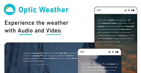 Introducing Optic Weather - the ultimate (and beautiful) weather app designed to help you experience the weather like never before. Optic Weather gives you the most accurate and comprehensive weather forecast possible combined with cutting-edge technology, stunning visual and audio effects, and an easy-to-use interface to give you the most relaxing weather experience.