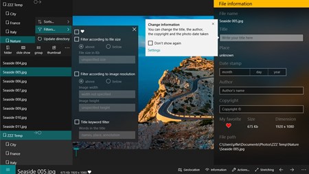 Who was photographed? What does this picture represent? Where was the photo taken? When was it taken? These are the four questions that everyone asks about their photo album: who, what, where, when. Thus the name Photos 4W. 15 days free trial. Photos 4W allows you to the 4Ws and to attach metadata permanently (title, author, copyright, shooting date and geolocation) to your snapshots with. jpg or .jpeg formats (. png and .bmp formats are not supported due to the fact it doesn't have such fields). Photos 4W also allows you to sort, search, visualize and locate your photos easily using group names, search filters and sorting (image dimension, file size, portrait or landscape orientation, title keywords, shooting date, and favorite photos). Photos 4W functions utilizing organized directories rather than libraries that are only pointers on scattered directories, making locating files easier. Let's not forget that the number one for loss of photographs is forgetting to save them! Photos 4W organizes itself into file groups. A group is a set of files whose name ends with a space followed by three digits. Landscape 001. jpg, landscape 002. jpg, etc. In this example the group will be identified by 'Landscape'. Photos 4W allows you to move, rename, delete groups easily without having to do tedious file-by-file manipulations. Various visualization mode: it is possible to visualize your album by photo, by slideshow, by groups and by thumbnails. By photo: geolocation on map, stretching 3 modes, information (title, location, shooting date, author, copyright, favorite, dimension, size), zoom, rename, move, delete and send the photo. By slideshow: manual scrolling, stretching, adjustable automatic scrolling. By group: rename, move, delete, view selected groups in thumbnail mode. By thumbnail: a general view by thumbnail that can be selected, reorganize by dragging and dropping for the rename, move, delete action. Your favorite images are immediately identified by a heart icon. The app alerts the user in advance to duplication of file names during renaming or moving so an alternate name or action can be selected. The app provides automatic orderly renaming of groups to keep your photos organized and easily accessible. Not only does Photos 4W makes it possible to map the geolocation coordinates of an image if they exist, but also, to add (or modify) them. This metadata will accompany the photograph throughout its existence: the question "where has it been taken" is easily answered! Photos 4W allows you to timestamp your photos. The shooting date is much more reliable than the file date because it will remain constant as the photo is copied, moved or renamed. Edit and save the title. Again, writing a title that will be recorded in the photograph is much more stable and accurate than only the file name. In a title, you can put the names of the people photographed, the description of the place, the occasion and any other useful annotation. It is sometimes necessary to modify a photograph or image: crop, resize, correct imperfections. To do this, Photos 4W allows you to easily open the image of your choice in the dedicated application. We suggest the Microsoft Photos app or Microsoft Paint 3D. It is also possible to open an image directly in Windows File Explorer with the 'open with' menu and choose Photos 4W or directly on 'open' if you have associated one of these extensions (.jpg, .jpeg, .png, .bmp) with the Photos 4W app. Photos 4W is not intrusive and protects your privacy. In no way does it send your images to the Internet or save your geolocation.