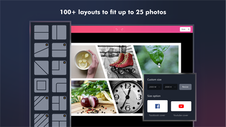 Edit your photo collage to mold it the way you’d prefer Choose a custom background by adding an image from the gallery Easily modify the size, color and spacing of text, background, frame and stickers Easily resize your picture collage to a custom size or different aspect ratios like Portrait, Landscape, Facebook, Instagram and Twitter Easily edit the photo spacing, collage margin and corner roundness of your collage Use layers to re-arrange the elements on your collage Use pastel colors to give a soft visual appeal to your pic collage