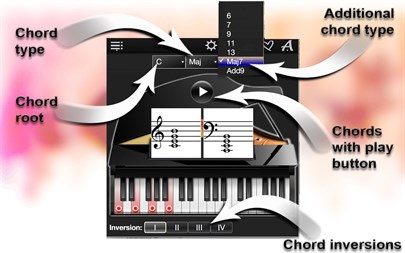 Try 1 day for FREE! Find the perfect chord voicing for your songs on the piano! Thanks to a specially developed algorithm, the app can show you more than 2,500 chords. Simply select a chord root on the left, chord type in the middle, the chord type addition on the right, and explore the chords with “Piano Chords Compass”! The App features: - A unique option that lets you listen to each displayed chord with authentic grand piano sound; - Drag&Drop lets you move your selected chord, either as written notes or as a keyboard representation, into editors to create your own songbooks; - Supported treble clef and bass clef for written notes; - Supported chord inversions; - Supported 56 chord types: Maj, Maj 6, Maj 7, Maj 9, Maj 11, Maj 13, Maj Maj7, Maj Add9, Min, Min 6, Min 7, Min 9, Min 11, Min 13, Min Maj7, Min Add9, Dim, Dim 6, Dim 7, Dim 9, Dim 11, Dim 13, Dim Maj7, Dim Add9, Aug, Aug 6, Aug 7, Aug 9, Aug 11, Aug 13, Aug Maj7, Aug Add9, Sus2, Sus2 6, Sus2 7, Sus2 9, Sus2 11, Sus2 13, Sus2 Maj7, Sus2 Add9, Sus4, Sus4 6, Sus4 7, Sus4 9, Sus4 11, Sus4 13, Sus4 Maj7, Sus4 Add9, 5, 5 6, 5 7, 5 9, 5 11, 5 13, 5 Maj7, 5 Add9, - Volume control.