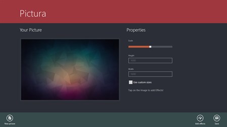 With a modern and intuitive interface, Pictura gives to you the ability to quickly edit your favorite photos and pictures. Complete integration with sharing services that gives you the possibility to download your photos directly from the web. A wide range of professional effects that give you the ability to edit photos like you never seen before.