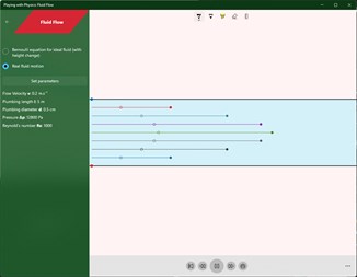 The "Projectile Motions" app enables verification of the basic laws applicable to a flowing ideal liquid. Users choose the basic parameters – the dimensions of the tube in the widest and narrowest part and the speed of the flowing liquid. The animation plots the trajectory of 3 particles, and the instantaneous pressure values in both locations can also be read from the application. After adjusting the inclination, changes in velocities and pressures in the tube with variable height can be observed. In the animation part, you can observe the flow of a real liquid in a horizontal pipe. A part of all parts of the animation are lists of values of quantities.