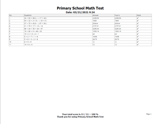 Primary School Math Test trains kids, even adults’ mathematical ability by answering math questions that are randomly created based on user’s selections of level and math operators. Higher level and more math operators create more difficult math questions. Keyboard is used to key in only number and decimal to answer a math question. Mouse is used to press buttons. Test result with score marks is shown on App front panel. User can save or print Test Report. If used improperly, App will give instructions for user to follow. It is easy to use, easy to improve user’s mathematical ability.