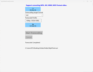 Support video conversion: MP4 to H.264/MP4, MP4 to AVI, MP4 to VC-1/WMV AVI to H.264/MP4, AVI to AVI, AVI to VC-1/WMV WMV to H.264/MP4, WMV to AVI, WMV to VC-1/WMV MOV to H.264/MP4, MOV to AVI, MOV to VC-1/WMV
