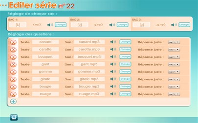 Cette application permet de travailler efficacement la discrimination auditive et la discrimination visuelle. L'enfant écoute les mots et déplace les étiquettes correspondantes dans les bons "sacs à sons". On peut afficher l'écriture des mots si on le désire.