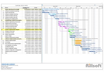 Rillsoft Project Freeware is available like a network plan as well as a Gantt chart, in which the duration, dependencies, start and end dates of activities can be edited directly. Representation of long-running projects is no problem. The time scale can be changed flexibly from hours to years. The Gantt chart provides a quick and up-to-date overview of the development of the projects. Further functions of Rillsoft Project Freeware: • Sub-projects or project phases bring a structure to the project plans • Milestones mark the important project events and provide warning messages in the event of time delays • Links between activities ensure automatic scheduling when processing plans • Calculation of the critical path and the reserve time and their representation • Forward / backward termination • Bar formatting and notes on activities • Referring links to documents in both text and image format • Import / export options to MS Excel, MS Project, XML • Print in PDF format