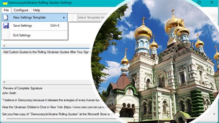 DemocracyIsUkraine Rolling Email Quotes helps raise awareness of the War in Ukraine with every email you send. Awareness that is Key in our Polarized World. Rolling Quotes inserts inspirational quotes into your email signature and raises awareness of Russia's war of aggression in Ukraine, the Ukrainian fight for democracy (both theirs and ours), the aspirations of the Ukrainian people and the work of non-profit organizations trying to relieve the pain and suffering in Ukraine. This app runs in your system tray where you can configure your rolling quotes and copy them into your clipboard for insertion into any e-mail. Get the DemocracyIsUkraine Outlook Add-In to automatically insert your quotes into your customized Outlook signature files as well. Photos courtesy of https://www.goodfreephotos.com.