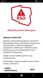 RSO – Regionalny System Ostrzegania (RSO) to bezpłatna aplikacja mobilna powstała przy współpracy Ministerstwa Spraw Wewnętrznych i Administracji z Telewizją Polską S.A. Aplikacja ta jest elementem szerszej usługi informowania społeczeństwa o zagrożeniach na terenie Polski za pośrednictwem różnych kanałów informacyjnych: strony internetowe wojewodów, paski informacyjne i telegazeta w telewizorach odbierających sygnał naziemny DVB oraz internetowa telewizja hybrydowa hbbtv. Poprzez RSO Wojewódzkie Centra Zarządzania Kryzysowego (WCZK) podległe wojewodom przekazują użytkownikom aplikacji mobilnej komunikaty o zagrożeniach różnych typów. W zależności od ich ważności dzielą się one na: • Powiadomienia – mają charakter informacyjny, • Ostrzeżenia – oznaczają ewentualne zagrożenie, znaczące lokalne problemy, a także dotyczą ostrzeżeń wydawanych przez IMGW. Treści takie ukażą się na paskach odbiorników telewizyjnych odbierających sygnał DVB w telewizji regionalnej TVP. • Ostrzeżenia alarmowe – oznaczają poziom zagrożenia, który wymaga dotarcia z informacją do większej grupy mieszkańców dlatego na poziomie regionalnym WCZK uruchamia rozpowszechnianie informacji także kanałem PUSH oraz na paskach odbiorników telewizyjnych odbierających sygnał DVB w kanałach TVP. W ramach RSO funkcjonują następujące typy komunikatów: f) ogólne g) meteorologiczne h) hydrologiczne i) drogowe j) dotyczące stanu wód W miarę rozwoju aplikacji i polityki informacyjnej mogą pojawić się nowe ich kategorie. Użytkownik ma możliwość wyboru typu komunikatu oraz z jakiego regionu chce go otrzymywać: jednego, kilku województw lub całego kraju. Aplikacja ponadto posiada opcję geolokalizacji, do aktywowania i ustawienia przez użytkownika. Włączona geolokalizacja umożliwia przekazywanie ostrzeżeń alarmowych i komunikatów właściwych dla położenia użytkownika. W aplikacji RSO można korzystać także z bogatej biblioteki poradników postępowania w sytuacjach kryzysowych lub w obliczu zagrożenia. Formułowane są one w możliwie prosty i łatwy do zrozumienia sposób, stale aktualizowane i udostępniane użytkownikom bez potrzeby aktualizacji aplikacji mobilnej. RSO spełnia więc także ważną funkcję edukacji społeczeństwa w zakresie rekomendowanych zachowań w sytuacjach kryzysowych. Zapraszamy do korzystania z aplikacji mobilnej RSO – Regionalny System Ostrzegania. Życzymy jak najmniej zagrożeń i ostrzeżeń!