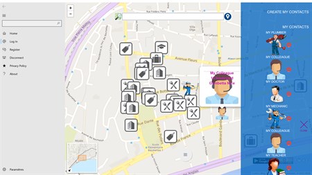 This software allow to manage your contacts on a map, possibility to have aerial satellite map, road map. You can show all market around you. You can create and manage your contacts and see their location. Find any location on the map and all market around. You have a private and secure access to yours personal datas with a private connexion or by Google account authentication. Select you type of contact : doctor, mechanics, friend or colleague and after search the location and create a pin for your new contact.