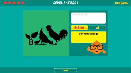 ======== Bahasa ======== Tebak gambar, Menguji imajinasi, logika dan nalar. Permainan tebak gambar adalah permainan asah otak ringan, kumpulan gambar disusun sedemikian rupa sehingga bisa menimbulkan sebuah kosakata baru yang diadaptasi dari istilah sehari-hari, ungkapan unik dan lucu, ataupun berupa isu dan peristiwa yang sedang terjadi. Game ini sangat kreatif dan unik dalam menguji otak kita untuk bisa menemukan jawaban-jawaban dari setiap gambar yang disajikan. Bisa menjawab satu gambar akan menimbulkan rasa penasaran untuk gambar berikutnya. Semakin naik level akan semakin ketagihan untuk bisa segera menyelesaikan game ini. Pemain akan dipacu untuk bisa menyelesaikan 180 tebak gambar yang dipisah menjadi 9 level. Di setiap akhir level, ada tantangan raja gambar yang harus diselesaikan sebelum batas waktu berakhir. Mengalahkan raja gambar adalah sebuah kewajiban agar bisa menuju ke level yang lebih tinggi. Tetapi, Jangan sampai kehabisan "hati" dalam game ini, karena user akan menanggung hukuman yang lumayan bikin bete. Yok, main tebak gambar, seru dan menyenangkan! ======= English ======= Tebak Gambar, challenging imagination, logic and reason. Tebak Gambar game is a light brainstorming game, pieces of picture are set as they form new vocabulary, which is adopted from daily slang, unique and funny phrase, or even any happening events and issues. This game is so creative and unique in testing our brains, in order to find the answers of questions. When one have succeeded in answering one question, he will get even more curious to figure out the next picture. The higher level, the more curiosity to finish the game. The player will be pursued to solve all 180 pictures, which are divided in 9 levels. In the end of every level, there's an extra challenge called King of Picture, where it has to be solved before the time is over. Beating King of Picture is a main requirement to reach higher level. But watch out, don't lose all 'hearts' because it will give you punishment. Let's guess the picture, fun and amusing!