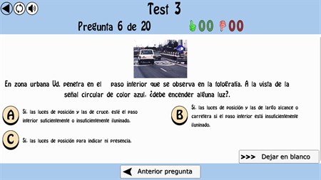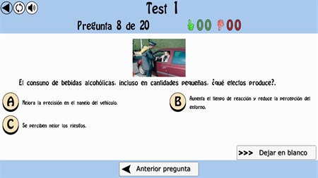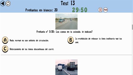 - 200 test de examen (Todos oficiales de la DGT) - Más de 4.000 preguntas. - Dos modos de realizar un mismo test (modo de respuestas instantáneas o modo examen). - Estadísticas de los test realizados: - Se guardan los resultados (aciertos y fallos) - Posibilidad de volver a contestar las preguntas erróneas - Simulación de examen con preguntas aleatorias.